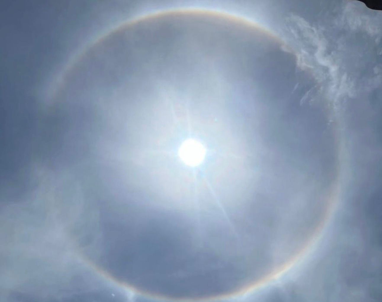 Fenomena alam yang dikenal sebagai halo matahari ini muncul setelah hujan gerimis sempat mengguyur sejumlah wilayah tak berselang lama, matahari kembali bersinar namun dengan tampilan yang berbeda dari biasanya lingkaran cahaya yang mengelilingi matahari tampak jelas dan memancarkan gradasi warna membuat siapa saja yang melihatnya takjub.